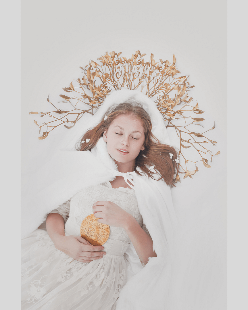 SYMBOLIKA SLUNCE a LUCIE — Nad ztvárněním svátku Yule jsem dlouho přemýšlela. Nechtěla jsem do něj vnášet anglosaské pojetí s červenozelenou cesmínou, a chtěla jsem najít něco, co se blíží mé představě sněhem zaváté zimy se zlatým nebem a zároveň se dotýká našich tradic. Mou bytostí pro svátek Yule se tedy stala Lucie, patronka světla, žena v bílém, co noci upije, ale dne nepřidá. Nemá zde věnec ze svící, jak je u ní obvyklé v severských zemích, propojila jsem ji s yulovou symbolikou, zlatým kotoučem symbolizujícím slunce a jmelím, odkazujícím na jeho nesmrtelnost.